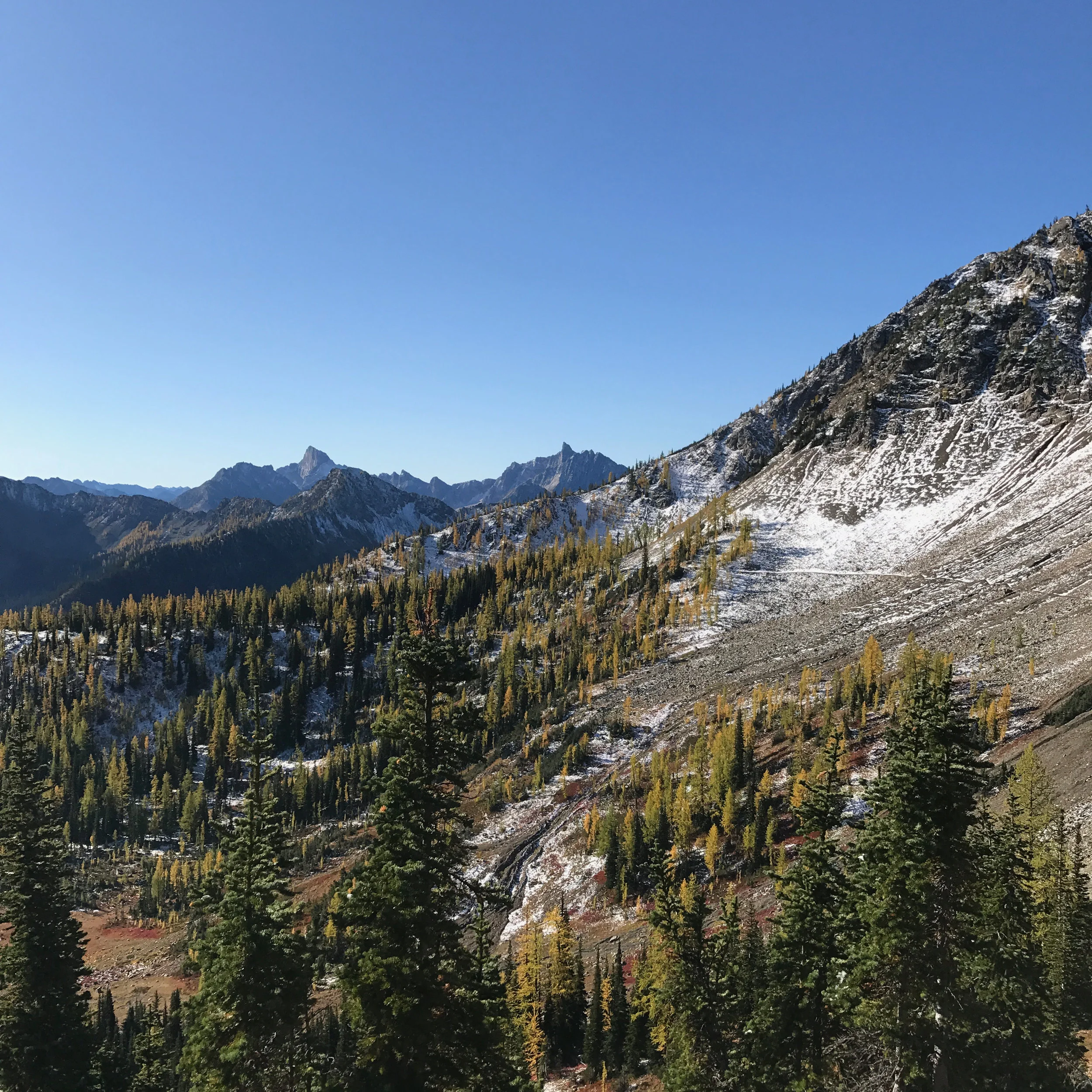 Views today were outstanding. Snow on north faces of mountains, fall colors and corridors of golden larches. Terminus tomorrow so we'll try to get going by 5:30am. It will be so COLD but we want to get to Manning with some time to spare before hopping on the Greyhound.